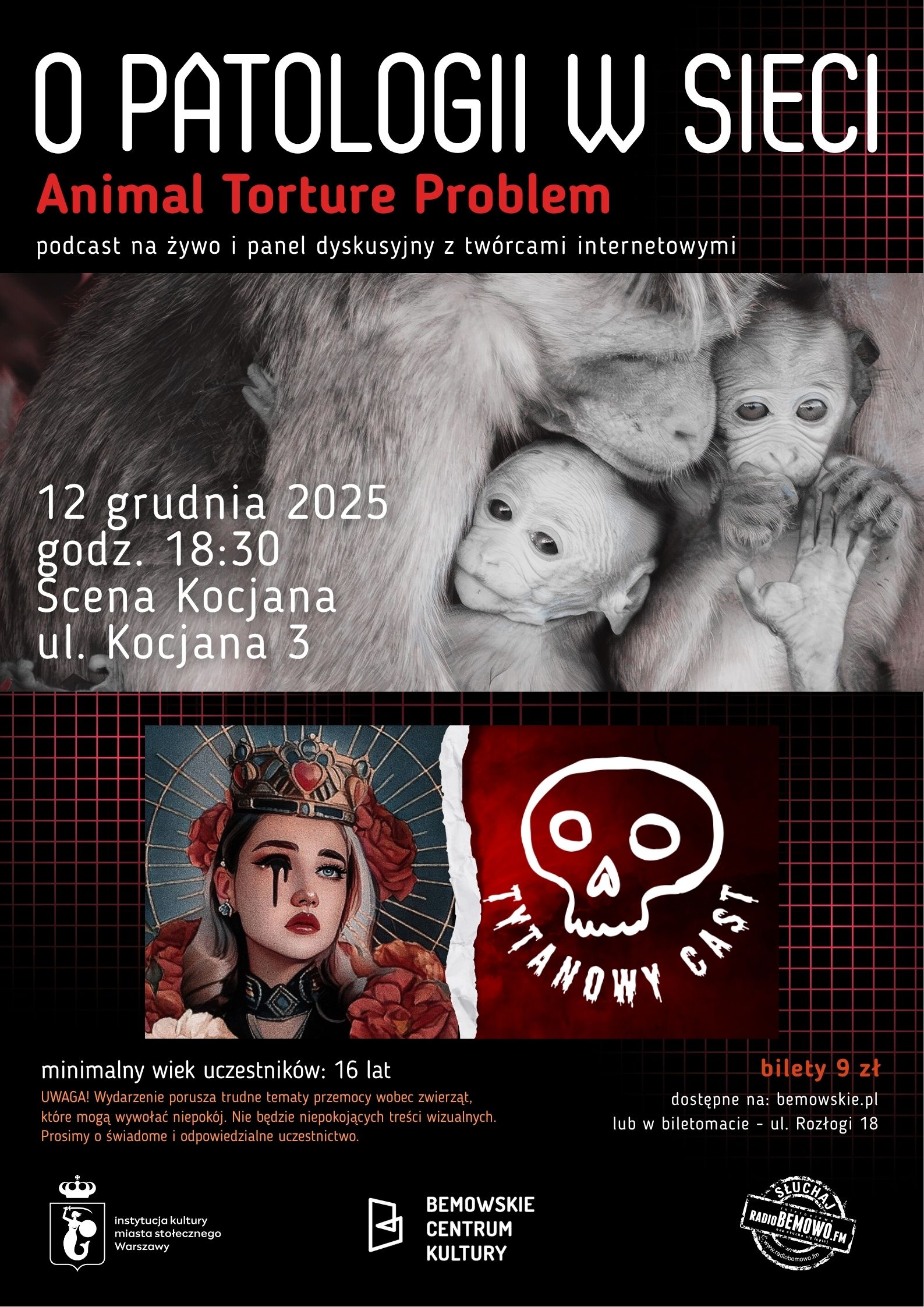 Spotkanie z cyklu “O patologii w sieci” dotyczące zjawiska przemocy wobec zwierząt rozpowszchnianego w internecie i tego jak okrutne treści stają się narzędziem do zarabiania pieniędzy. Problem przybliżą Dama Kier oraz Tytanowy Cast.