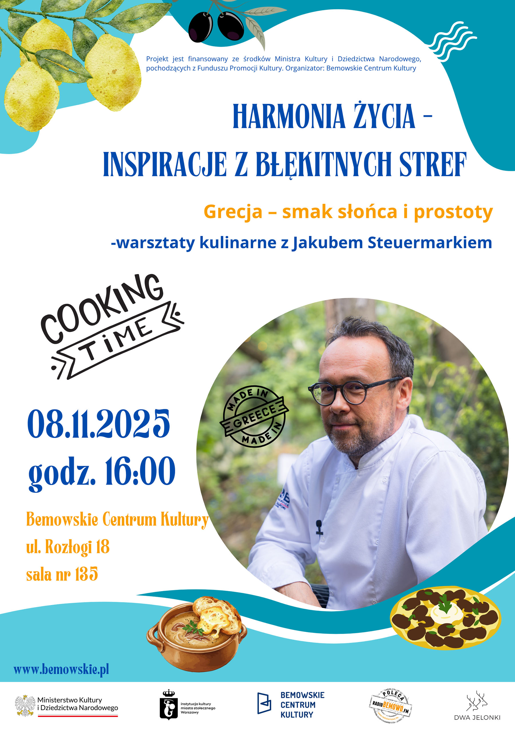 W ramach cyklu „Harmonia Życia: Inspiracje z Błękitnych Stref” zapraszamy na kolejne spotkanie, podczas którego Jakub Steuermark – kucharz, podróżnik i gospodarz kuchni programu „Pytanie na Śniadanie” – zabierze uczestników w podróż do słonecznej Grecji. Tam, gdzie jedzenie jest celebracją życia, a każdy posiłek to chwila spokoju, radości i bycia razem.