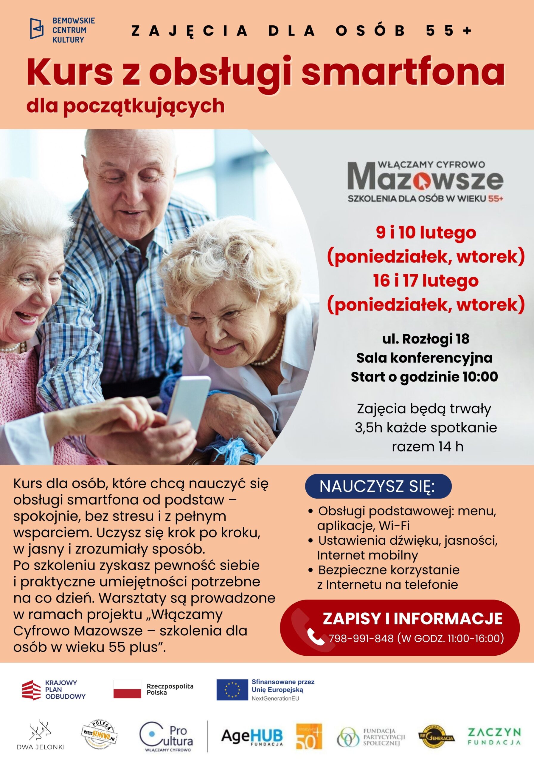Kurs dla osób, które chcą nauczyć się obsługi smartfona od podstaw – spokojnie, bez stresu i z pełnym wsparciem. Uczysz się krok po kroku, w jasny i zrozumiały sposób. Po szkoleniu zyskasz pewność siebie i praktyczne umiejętności potrzebne na co dzień. Warsztaty są prowadzone w ramach projektu „Włączamy Cyfrowo Mazowsze – szkolenia dla osób w wieku 55 plus”.