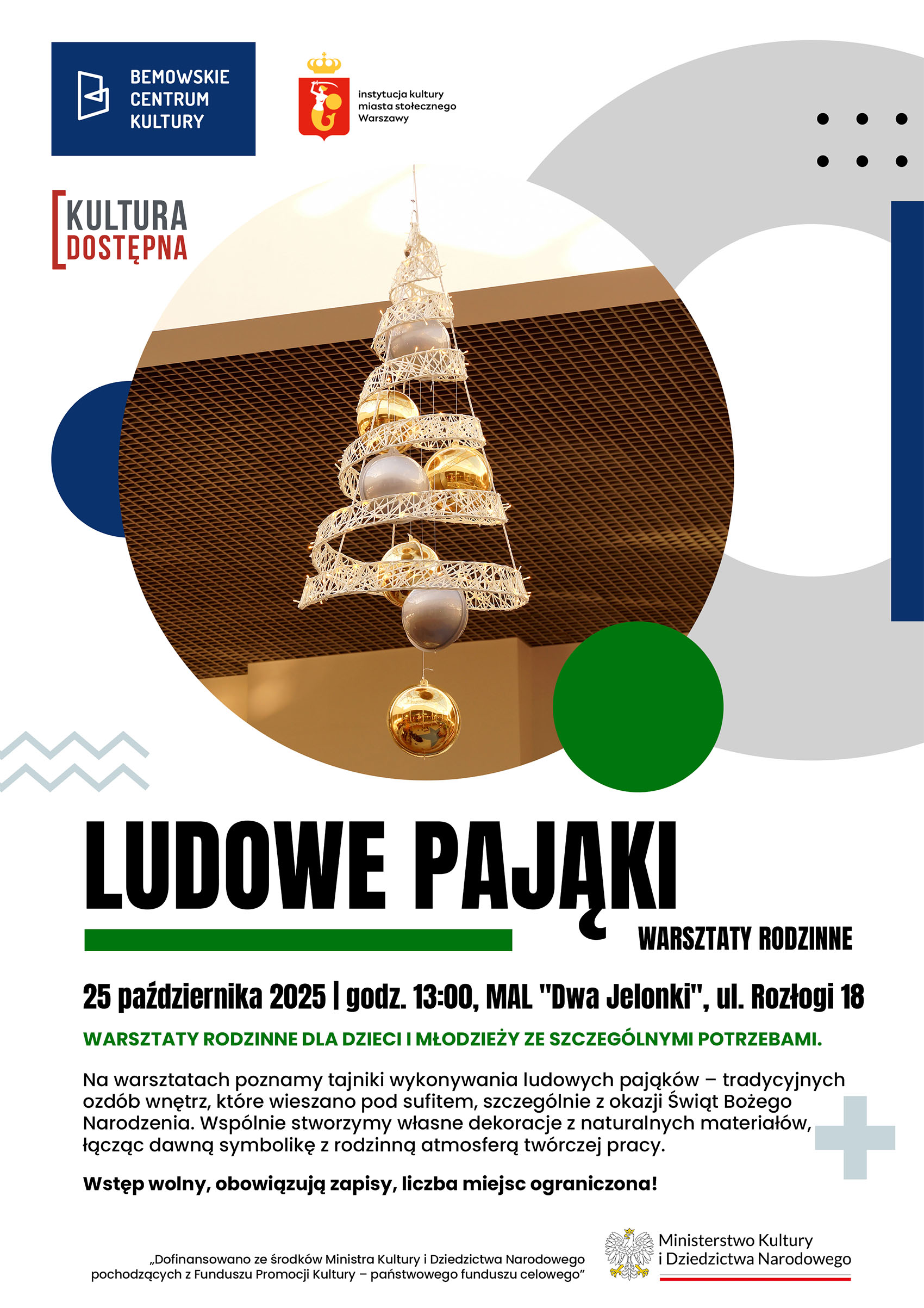 Zapraszamy na kolejne spotkanie w ramach cyklu „Budujemy mosty: arteterapia i kultura bez barier”, tym razem poświęcone tworzeniu tradycyjnych ludowych pająków – przestrzennych ozdób wieszanych pod sufitem, które dawniej zdobiły wnętrza szczególnie w okresie świąt Bożego Narodzenia.
