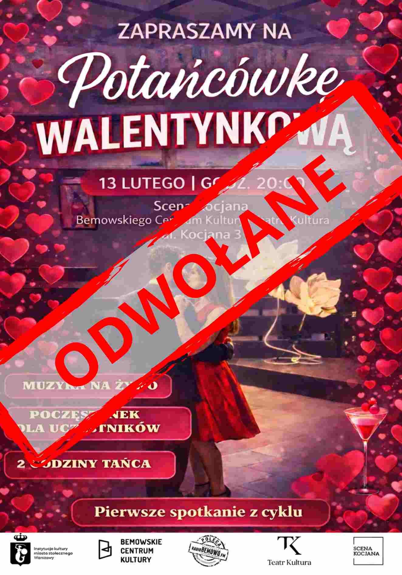 Zapraszamy na wyjątkowe, pełne ciepła i dobrej energii wydarzenie – Potańcówkę Walentynkową, która odbędzie się 13 lutego o godz. 20:00 na Scenie Kocjana Bemowskiego Centrum Kultury i Teatru Kultura. To idealna propozycja dla wszystkich, którzy chcą spędzić walentynkowy wieczór w radosnej, tanecznej atmosferze, przy dźwiękach muzyki na żywo zachęcającej do wspólnej zabawy.