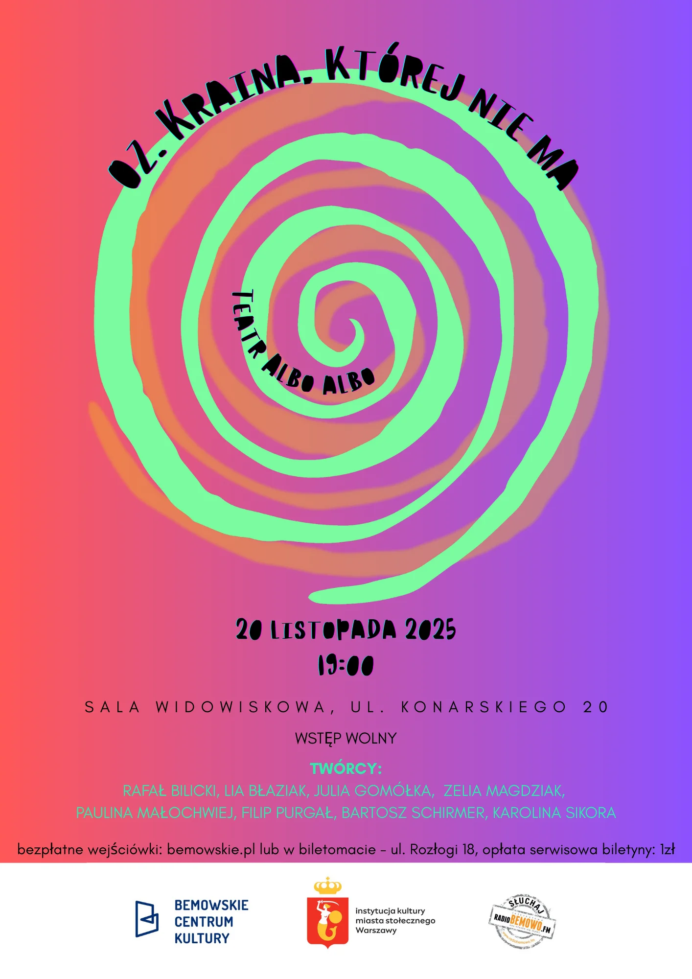 “Oz. Kraina, której nie ma” to spektakl oparty na motywach “Czarnoksiężnika z Krainy Oz” L. Franka Bauma. To podróż po onirycznym świecie tajemniczego Oza, w którym rzeczywistość miesza się z fantazją. Przewodniczką po tym świecie jest Dorota poszukująca powrotu do domu – do tego, co znane i prawdziwe. Jej podróż jest jednocześnie zaproszeniem, aby zaakceptować własną historię i powrócić do domu. Bo “wszędzie dobrze, ale w domu najlepiej”.