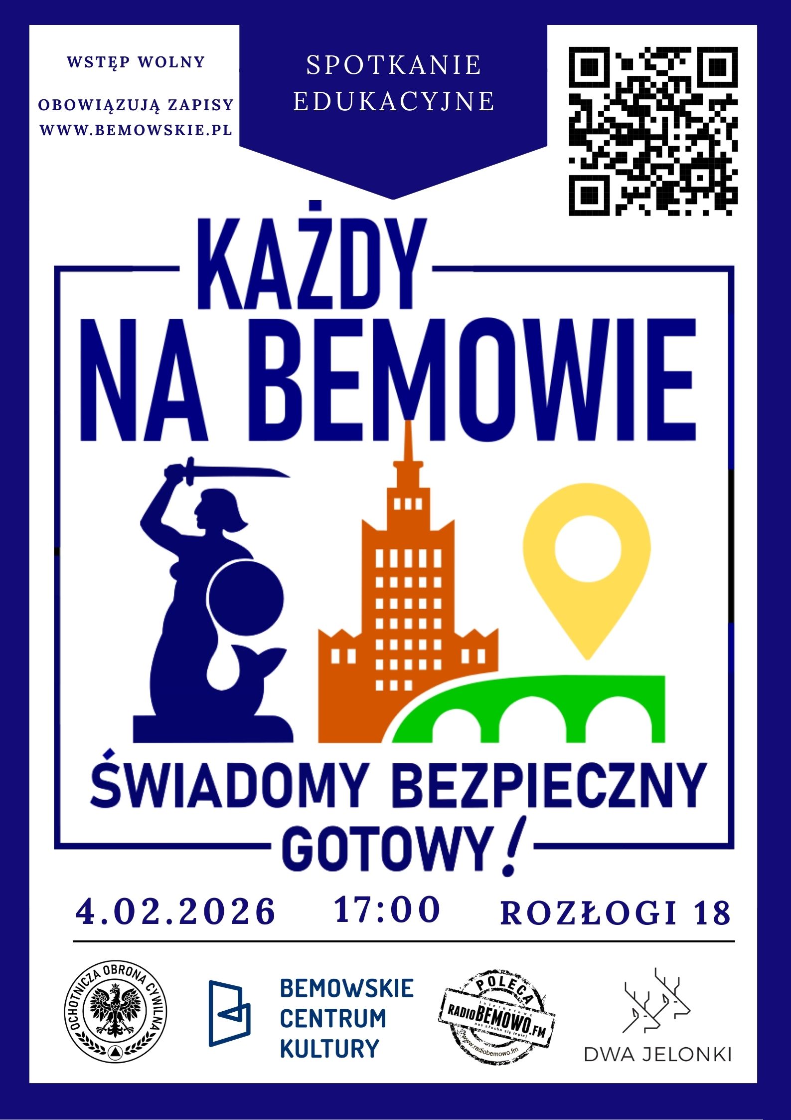 Zapraszamy na spotkanie edukacyjne dla dorosłych „Każdy na Bemowie świadomy, bezpieczny, gotowy”, w ramach którego mieszkańcy mogą bezpłatnie wziąć udział w praktycznych zajęciach edukacyjnych z przygotowania na sytuacje trudne i kryzysowe.