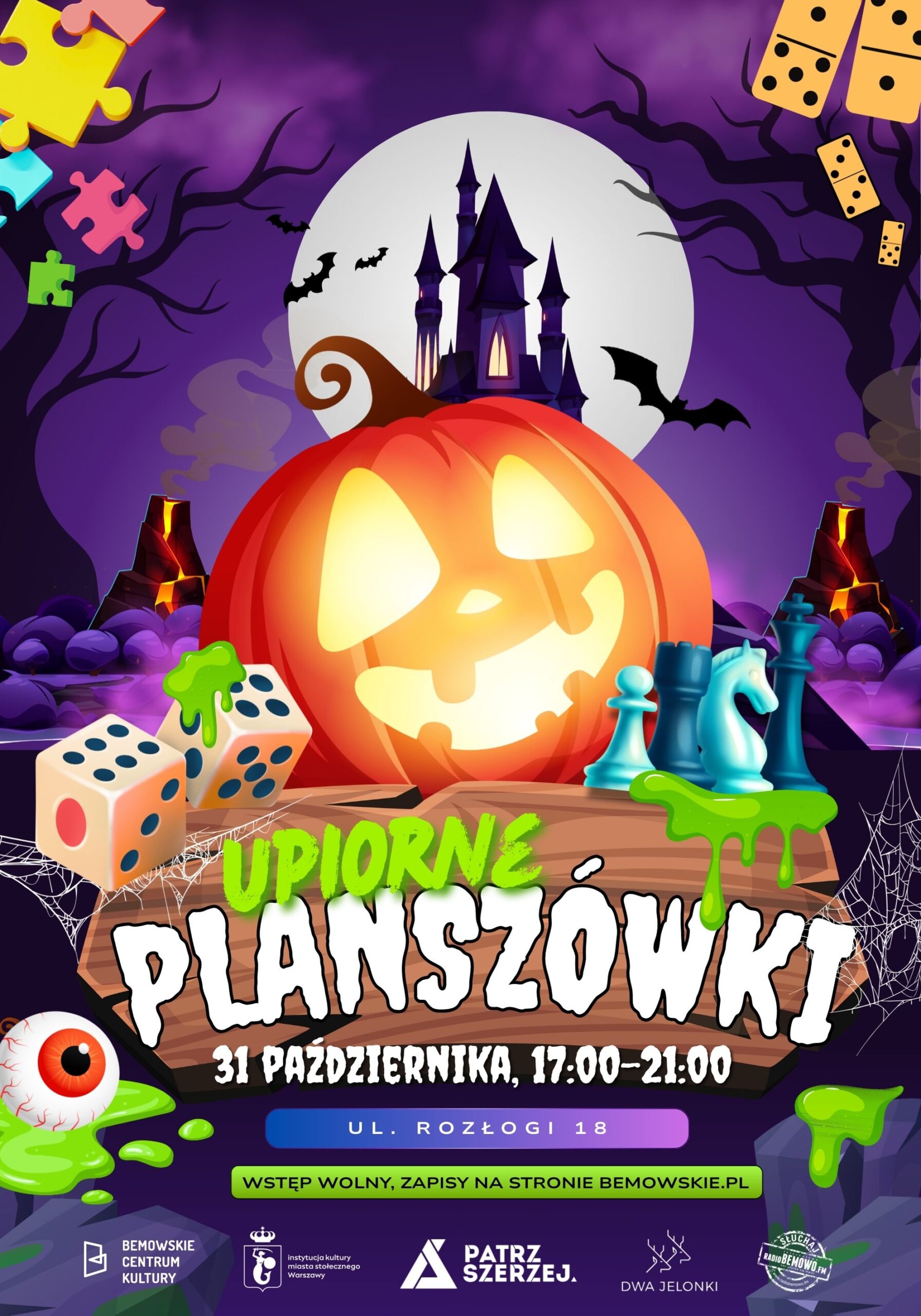 Podczas wydarzenia „Upiorne Planszówki” uczestnicy wezmą udział w rozgrywkach gier planszowych prowadzonych przez animatorów Fundacji Patrz Szerzej. Wśród przygotowanych tytułów znajdą się m.in. Betrayal at House on the Hill, Dracula vs Van Helsing, Mysterium, Odmęty grozy, Wilkołaki, a także inne gry utrzymane w klimacie Halloween. Całości towarzyszyć będą quizy i zabawy tematyczne, a także swobodna przestrzeń sprzyjająca integracji uczestników.