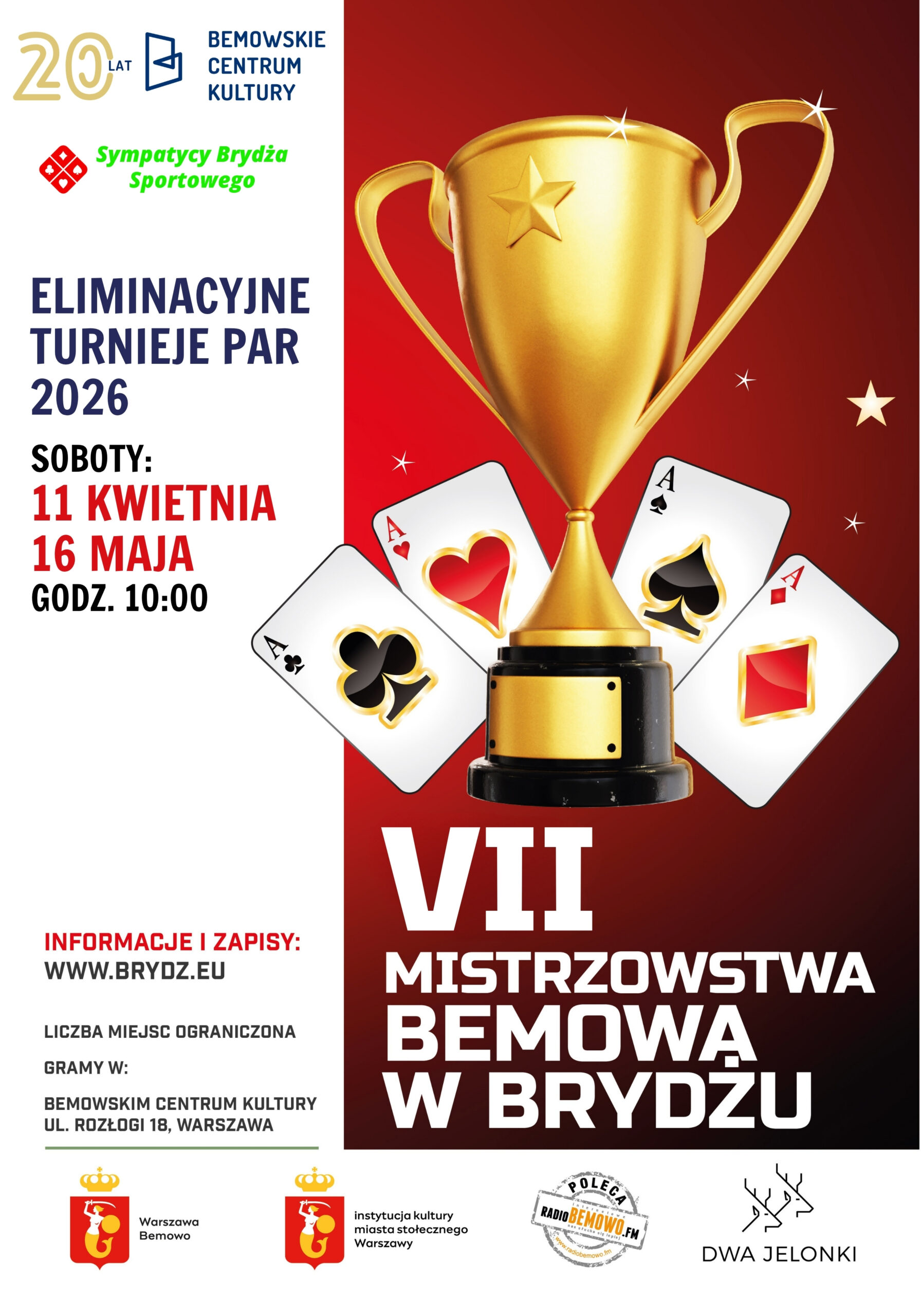 Serdecznie zapraszamy miłośników brydża na VII Mistrzostwa Bemowa w Brydżu.